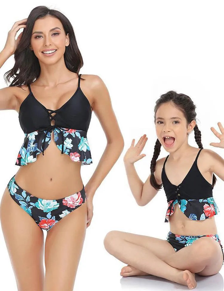 بدلة سباحة متطابقة للعائلة مكشكشة بالزهور