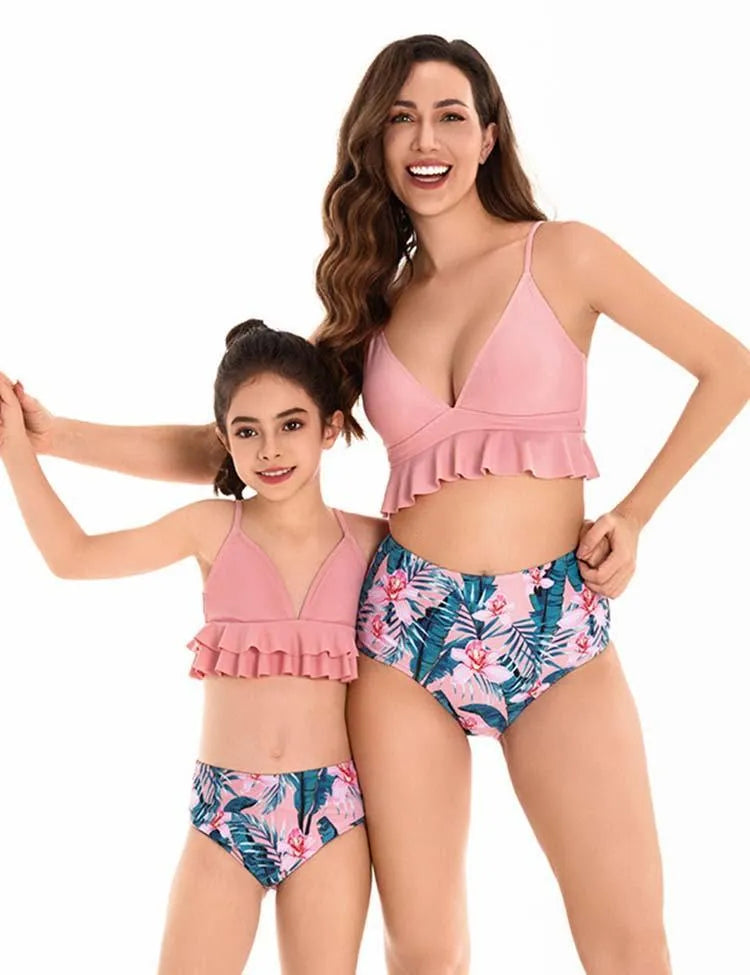 بدلة سباحة متطابقة للعائلة مطوية مطبوعة بالزهور