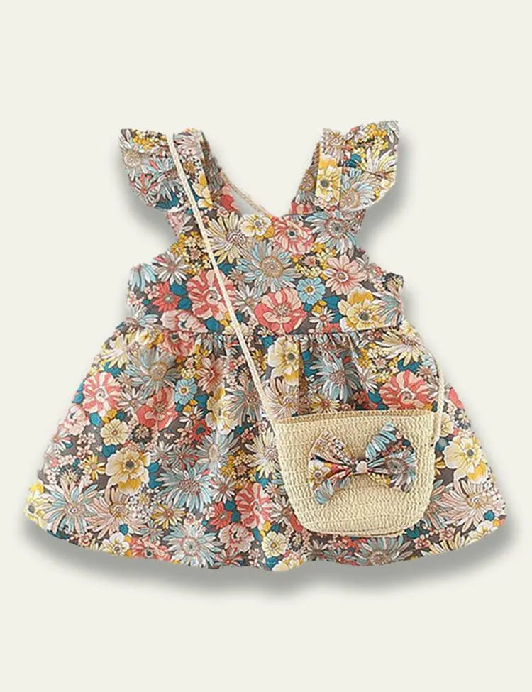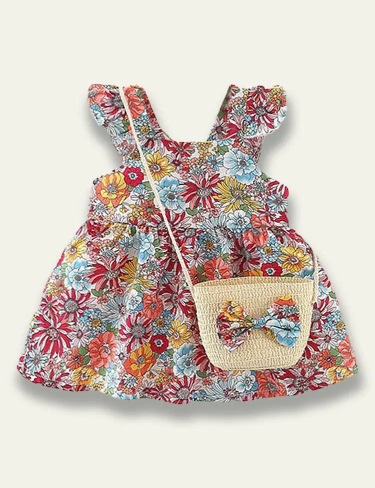 Flower Printed Sleeveless Dress+Floral Bow Bag